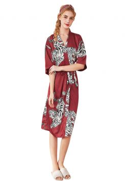 Op deze informatiepagina over rode badjassen moeten wij onze bordeaux-rode kimono van satijn voor heren uitlichten! Onlangs hebben wij namelijk een waanzinnig gave & modieuze satijnen kimono toegevoegd aan onze uitgebreide badjassen collectie. Binnen de range heren kimono’s van satijn is de rode, satijnen kimono met tijger hét paradepaardje. Mannelijke mannen omhullen zich in hun vrije tijd ook graag in chique lounge wear. De afbeeldingen van de tijger komen mooi uit op de bordeaux rode achtergrond van dit kimonomodel. De details zijn prachtig en de sjaalkraag en mouwuiteinden zijn fraai afgewerkt met witte, contrasterende bies. Deze rode satijnen kimono staat elegant en geeft uw relaxmomenten een spannende touche.