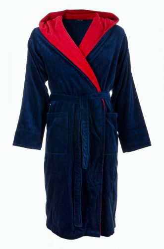 De stoere heren-badjas marineblauw heeft als bijzondere eigenschap dat de binnenvoering rood is. Als u de capuchon los draagt geeft dat een heel mooi contrast. De diepe kleuren maken deze badjas speciaal.