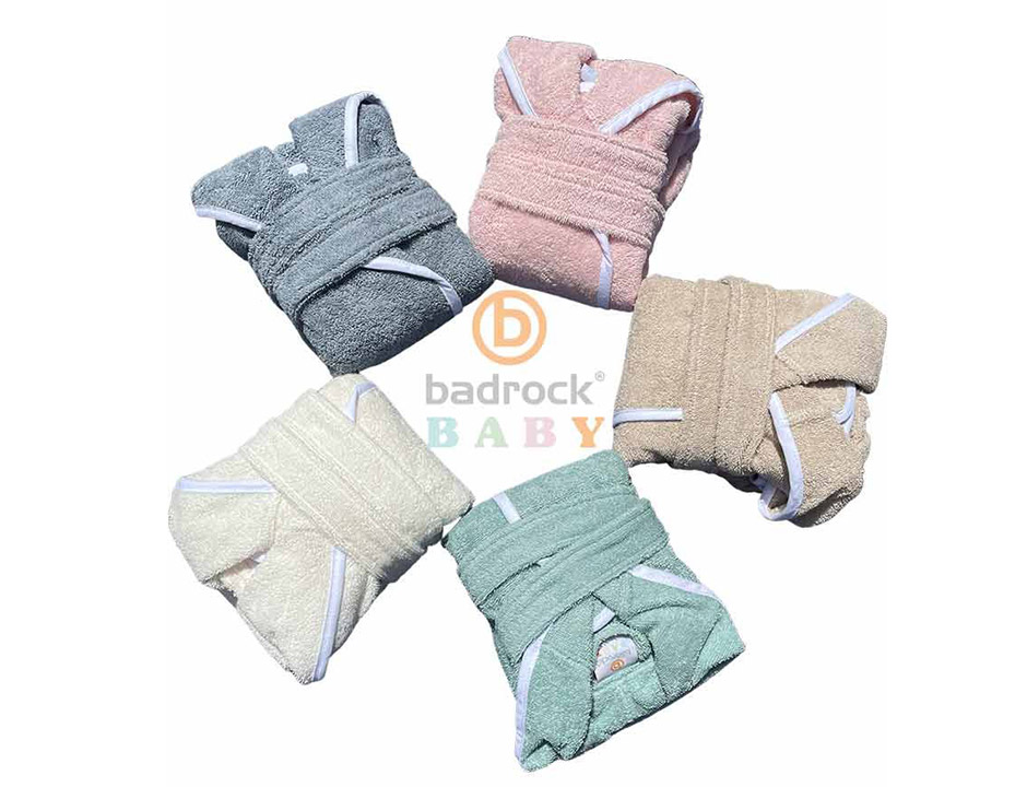 Ontdek het ultieme comfort voor uw kleintje met onze badstof babybadjasjes van Badrock in rustgevende natuurlijke kleuren. Deze schattige badjasjes zijn niet alleen stijlvol, maar ook praktisch voor de verzorging van uw baby. De badjasjes zijn ontworpen met een verfijnde witte bies, waardoor ze een tijdloze uitstraling hebben die perfect past bij de tedere huid van een baby. Het zachte badstof-katoen van deze babybadjasjes zorgt ervoor dat uw kleintje zich omhuld voelt in pure zachtheid. Na een verkwikkende douche of een warm badje wordt de badjas het ultieme knuffelstuk voor uw baby. De badstof fungeert als een absorberende handdoek, waardoor overtollig vocht snel wordt opgenomen. Dit niet alleen zorgt voor een comfortabel gevoel, maar ook voor het behoud van de natuurlijke warmte van uw baby. Het gebruik van hoogwaardig badstof-katoen heeft niet alleen een luxueuze uitstraling, maar biedt ook de praktische voordelen van sneldrogend materiaal. Dit is vooral handig in het dagelijkse leven van ouders, waar gemak en efficiëntie centraal staan. De babybadjasjes zijn voorzien van het Oeko-Tex 100 keurmerk, wat betekent dat ze voldoen aan strenge normen voor milieuvriendelijkheid en vrij zijn van schadelijke stoffen. Geef uw kleintje de beste verzorging met onze badstof babybadjasjes in natuurlijke kleuren. Het is niet alleen een functioneel kledingstuk, maar ook een liefdevolle omhelzing van comfort en zachtheid voor de kostbaarste momenten van uw baby's dag.