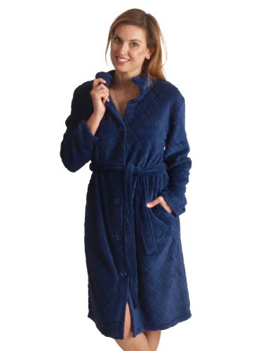 Deze damesbadjas met knoopsluiting heeft een modern, blauwe kleur met reliëf in wiebertjesmotief. Gemaakt van 250 grams fleecemateriaal.